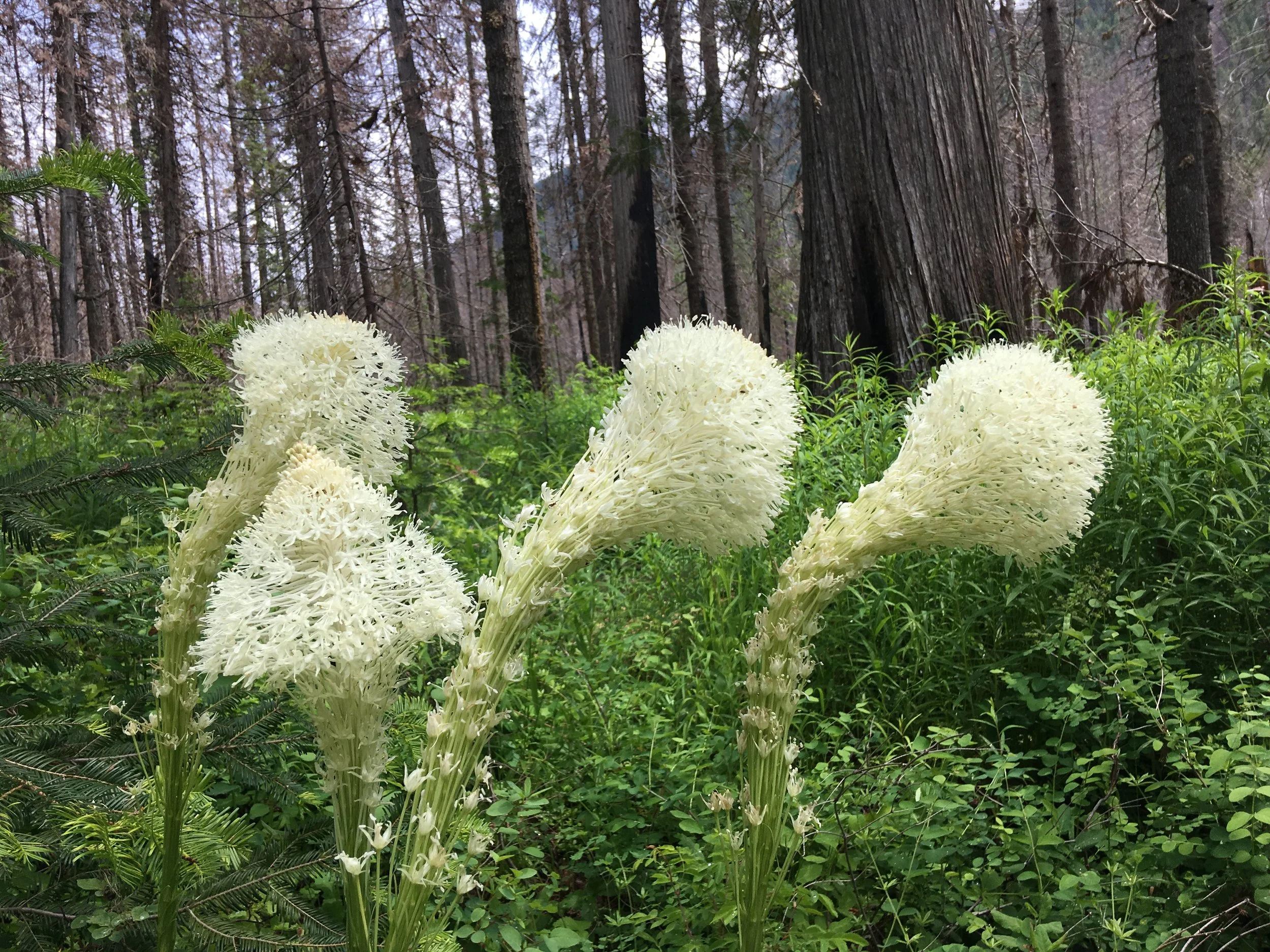 When the tea was gone it still hadn't rained, so I packed up and took my first steps up the Moose Creek trail. From the ranger station, the trail leads four miles north-east along a plateau before crossing Moose Creek on another large suspension bridge. The trail passes through big stands of timber, with wildfire burn scars here and there. On one tiny creek crossing there were signs of a massive flash flood - large tree trunks were piled high against the trees next to the trail. I found out later that the trail crew had needed explosives to clear the trail after that flood.